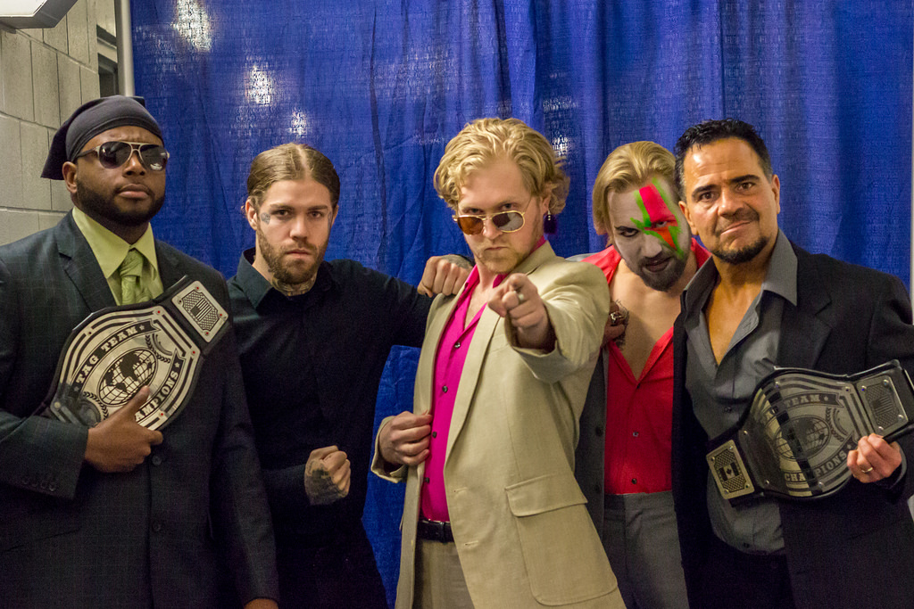 Southern Tier Wrestling will present the first event of its second season, “Gold Rush,” at the Northwest Arena on Saturday, April 1, at 6 p.m. Pictured are current Southern Tier Wrestling tag team champions The Divine Alliance and their manager, Jon Kennedy. Submitted photo by Steve Vincent