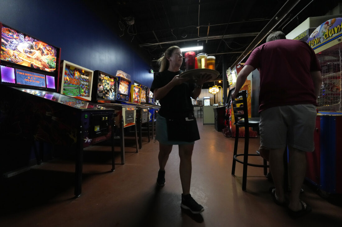 Awaitress carries a tray of drinks to a party at a brew pub in south suburban Littleton, Colo. America’s hiring boom continued in July as employers added a surprising 528,000 jobs despite raging inflation and rising anxiety about a recession. AP photo