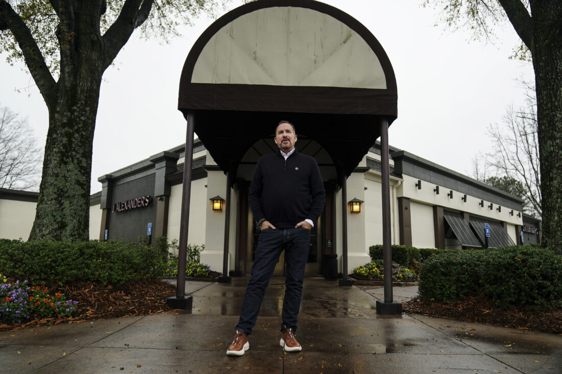 Josh Kern, the CEO of SPG Hospitality, poses at a J. Alexander’s, one of the restaurants operated by the company, on Wednesday, Dec. 14, 2022, in Atlanta. Restaurants and grocery stores are struggling to contain higher costs and figure out whether they can pass them along to customers as higher prices. AP photo