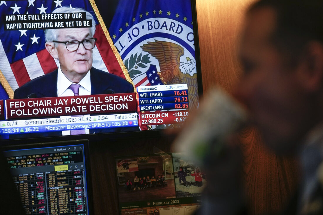 Traders on the floor at the New York Stock Exchange watch Federal Reserve Chair Jerome Powell’s news conference after the Federal Reserve interest rate announcement in New York on Feb. 1, 2023. A flood of data reports since the start of February have forced Wall Street to bring its forecasts for rates closer to the Fed’s. Key among them were reports showing inflation at both the consumer and wholesale levels isn’t slowing as quickly or as smoothly as hoped. AP photo