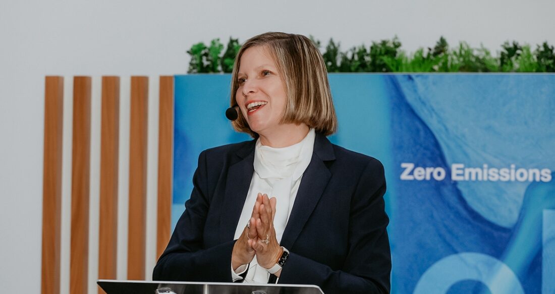 Jennifer Rumsey, Cummins president and CEO, speaks to employees. Photo courtesy Cummins.com