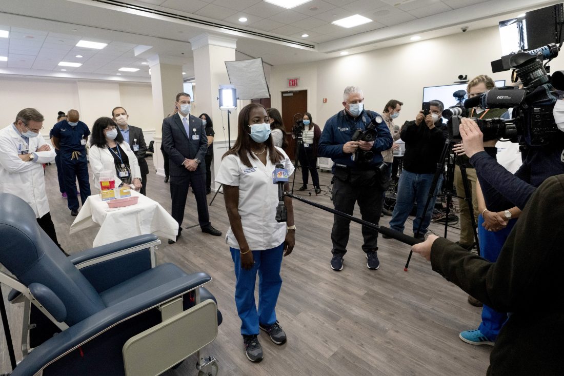 FILE - Nurse Sandra Lindsay, center, gives an interview after she was inoculated with the Pfizer- BioNTech COVID-19 vaccine, Monday, Dec. 14, 2020, at the Jewish Medical Center, in the Queens borough of New York. (AP Photo/Mark Lennihan, Pool, File)