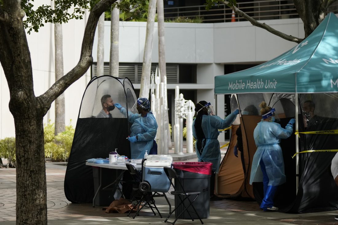FILE - People are tested for COVID-19, at a walk-up testing site run by Nomi Health, Tuesday, Dec. 28, 2021, in downtown Miami. More than a year after the vaccine was rolled out, new cases of COVID-19 in the U.S. have soared to the highest level on record at over 265,000 per day on average, a surge driven largely by the highly contagious omicron variant. (AP Photo/Rebecca Blackwell, File)