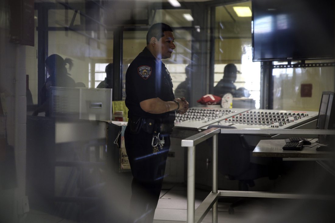 FILE - A corrections officer watches monitors at a security post in an enhanced supervision jail unit on Rikers Island in New York, on March 12, 2015. New York City’s troubled jail system is facing more turmoil: the suspension of hundreds of corrections officers for failing to meet a Tuesday night, Nov. 30, 2021, deadline to get vaccinated against COVID-19. The city’s Department of Correction reported 77% of its uniformed staff had gotten at least one vaccine dose as of 5 p.m. Monday, Nov. 29 (AP Photo/Seth Wenig, File)