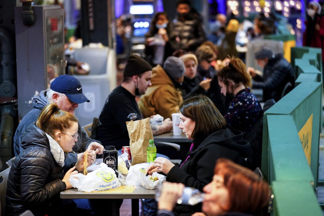 Customers eat at the Reading Terminal Market in Philadelphia, Wednesday, Feb. 16, 2022. Philadelphia city officials lifted the city's vaccine mandate for indoor dining and other establishments that serve food and drinks, but an indoor mask mandate remains in place. Philadelphia Public Health officials announced that the vaccine mandate was lifted immediately Wednesday. (AP Photo/Matt Rourke)