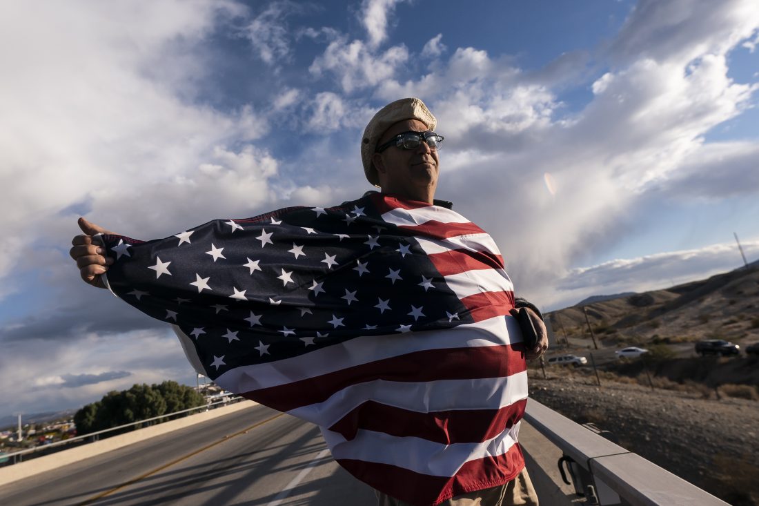 FILE - John Hiickman cheers on a convoy of truckers heading toward Washington to protest COVID-19 mandates, Feb. 23, 2022, in Needles, Calif. Omicron is fading away, and so are Americans’ worries about COVID-19. Fewer Americans now say they’re concerned they’ll be infected compared with January following the rise and fall of the wildly contagious coronavirus variant. That's according to a new poll from The Associated Press-NORC Center for Public Affairs Research. (AP Photo/Nathan Howard, File)