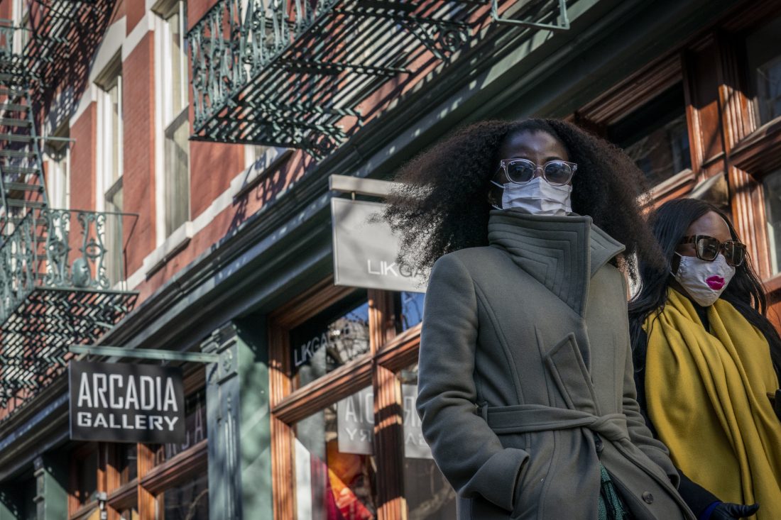 Pedestrians wearing protective masks walk along West Broadway in the SoHo district of New York, Friday, March 4, 2022. Mayor Eric Adams announced in a morning news conference that the city will be scaling back of COVID-19 mask and vaccine mandates. (AP Photo/John Minchillo)