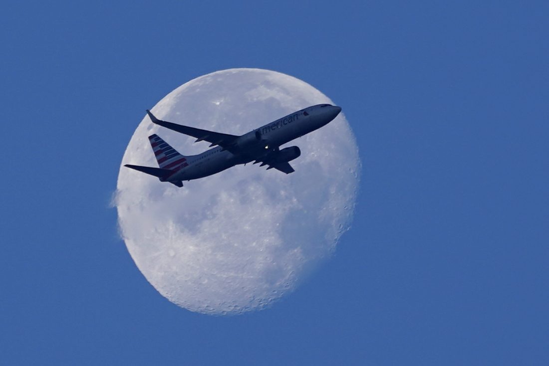 An American Airlines Boeing 737 flies past the moon as it heads to Orlando, Fla., after having taken off from Miami International Airport, Tuesday, April 19, 2022, in Miami. The major airlines and many of the busiest airports rushed to drop their requirements on Monday after a Florida judge struck down the CDC mandate and the Transportation Security Administration announced it wouldn't enforce its 2021 security directive. (AP Photo/Wilfredo Lee)