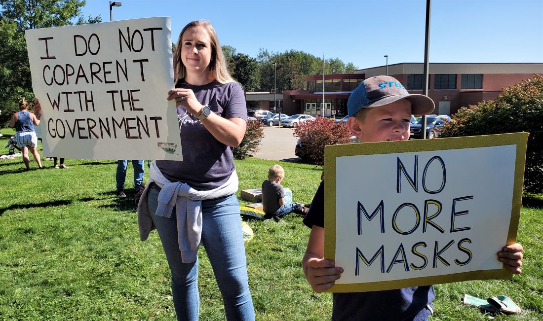 Natalie Hastings and Mason Hastings (8) are among a group of protesters outside of the Warren County School District central office Tuesday morning. The group wants to see a repeal of the state-wide mandate that masks be worn in school. Photos by Brian Ferry