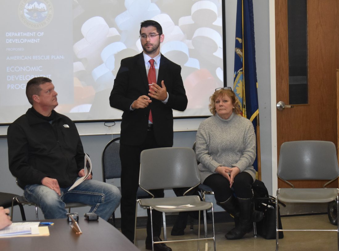 From left, Eric Hagglund, 4 Below Haggy’s Bar and Grill owner; Joe Town, Pace’s Pizzeria owne; and Patti Centi, Landmark Restaurant owner, discuss the need for financial assistance from the city via programs that will allocate American Rescue Plan Act funding. P-J photo by Dennis Phillips
