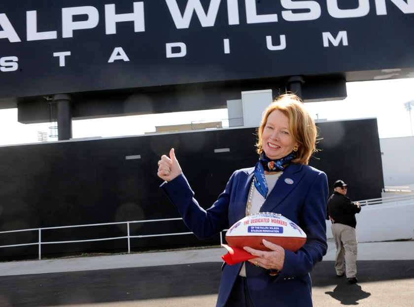 In this Sept. 14, 2014 file photo, Mary Wilson, wife of late Buffalo Bills owner Ralph C. Wilson, holds a game ball for stadium construction workers as she gestures to the new renovations to the stadium before an NFL game against the Miami Dolphins in Orchard Park. AP photo