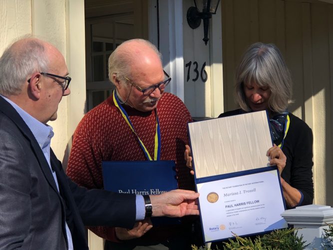 Rotarian David Troxell and his wife Marissa were presented with Paul Harris Awards by Rotarian Dan Overcash and his wife Brigetta at a recent ZOOM meeting of the Rotary Club of Jamestown.