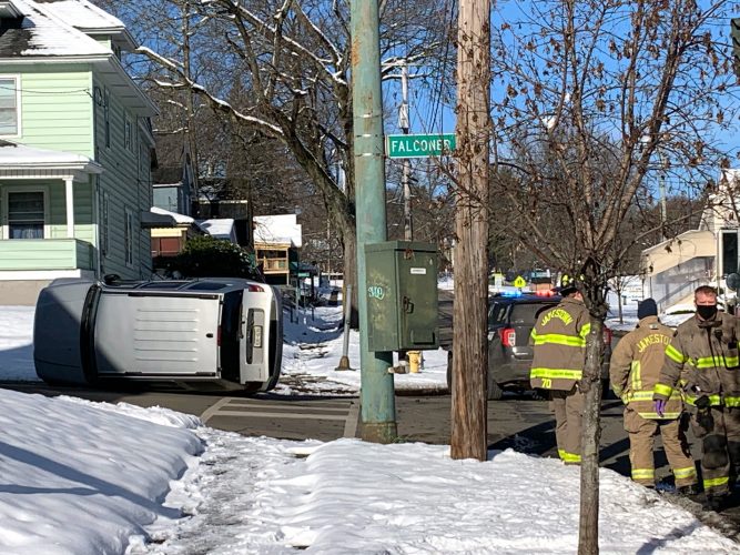 The crash was reported shortly before 10 a.m. at the intersection of Buffalo and Falconer streets. One vehicle overturned in the collision.